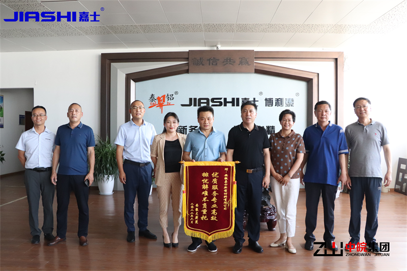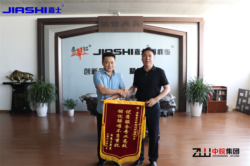 圖為安徽大劇院季總、張總等領(lǐng)導(dǎo)贈(zèng)予中皖集團(tuán)-嘉士鋁單板的錦旗。